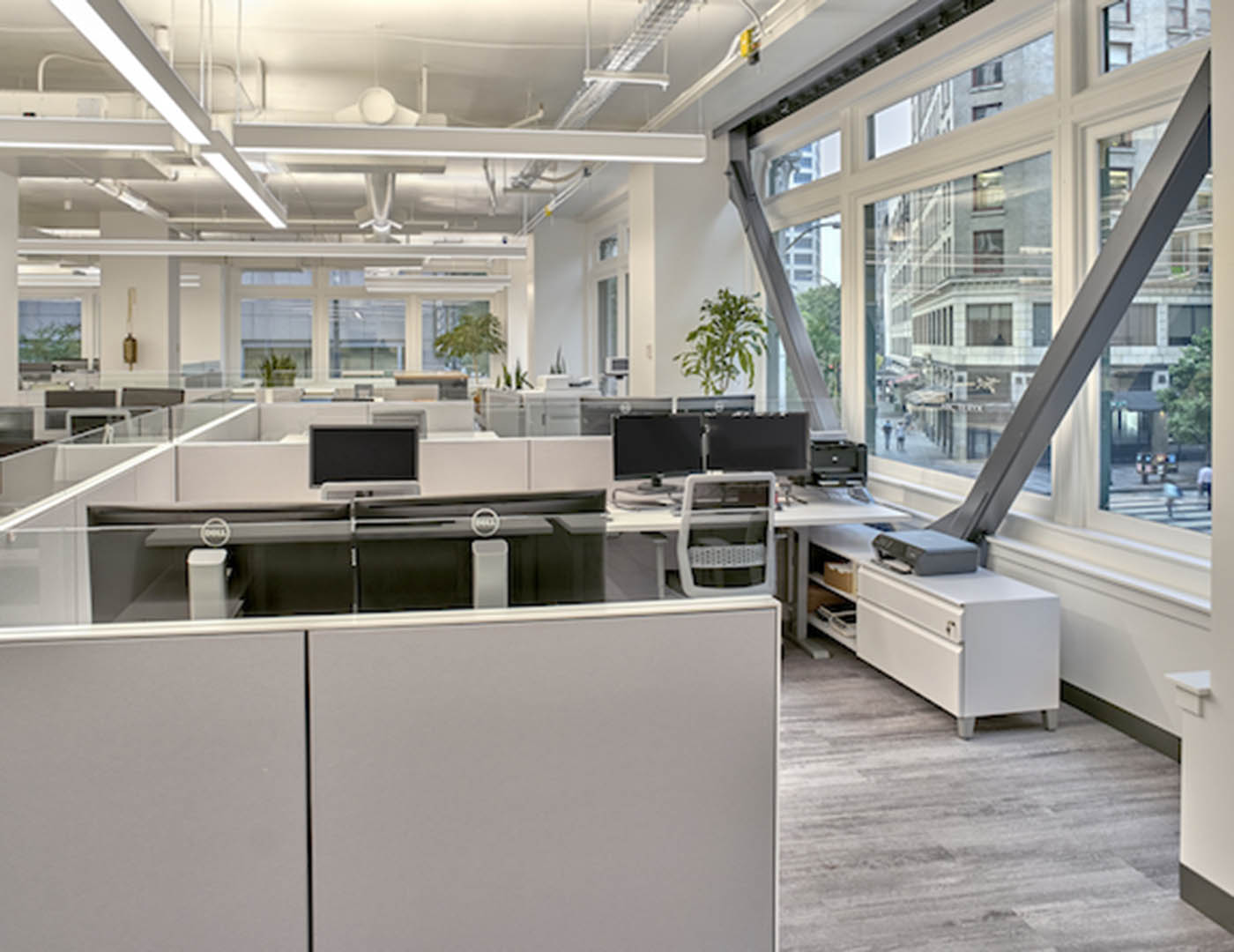 The new space was switched from retail to office use. The design focused on revealing the original architecture, while taking advantage of expansive windows and large skylights.