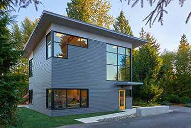 Located in a creekside meadow, the building had to sit on an existing foundation because its site is classified as a critical habitat where no new development is allowed. Staircases were placed on the outside of the building to maximize interior space, while legally remaining within the original specified footprint.