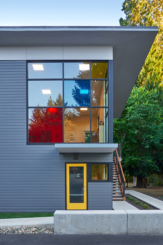 The use of primary colors, including the yellow entry door, also reflects the school’s curriculum.