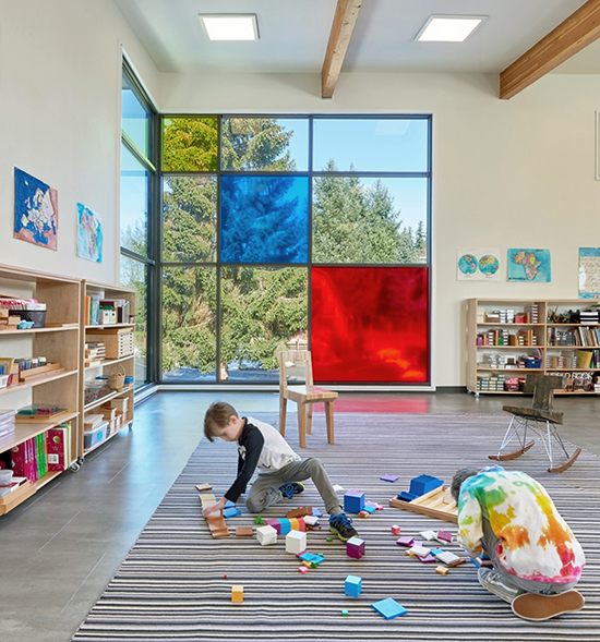 A new 3,900-square-foot Montessori school building in Bothell was inspired the trinomial cube, a Montessori teaching tool made of up wooden blocks.