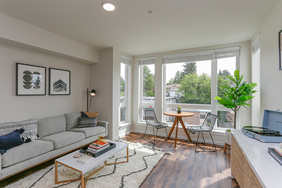 Apartments range from about 600 to 1,100 square feet, with open one-bedroom, two-bedroom and two-bedroom loft configurations. Included are six live/work lofts. Some units have views of the Olympic Mountains.