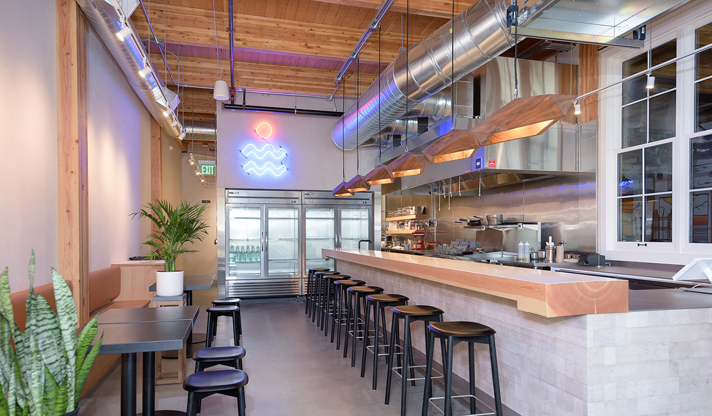 Bright display fridges show off fresh ingredients. A window to Aslan Brewing next door lets light — and flavors — pass back and forth.