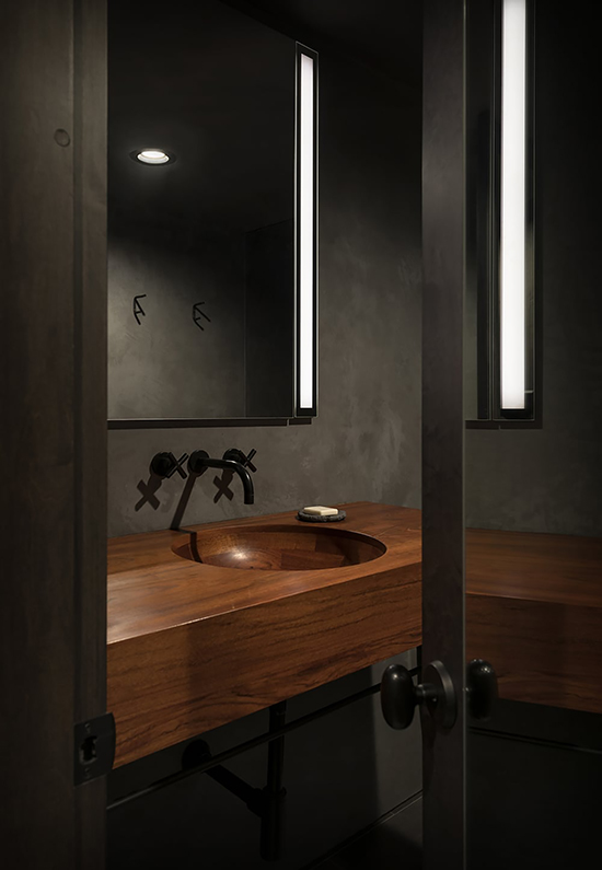 The architect remodeled and expanded the kitchen and bathroom spaces to be all housed in one box space that could be closed off from the rest of the open floor plan. This “box” was built using concealed storage both above the upper platform and in and around the sleeping nook. It was made using stained plywood on the exterior, a felt-lined bedroom, and a bathroom rebuilt with a new lining of venetian plaster.