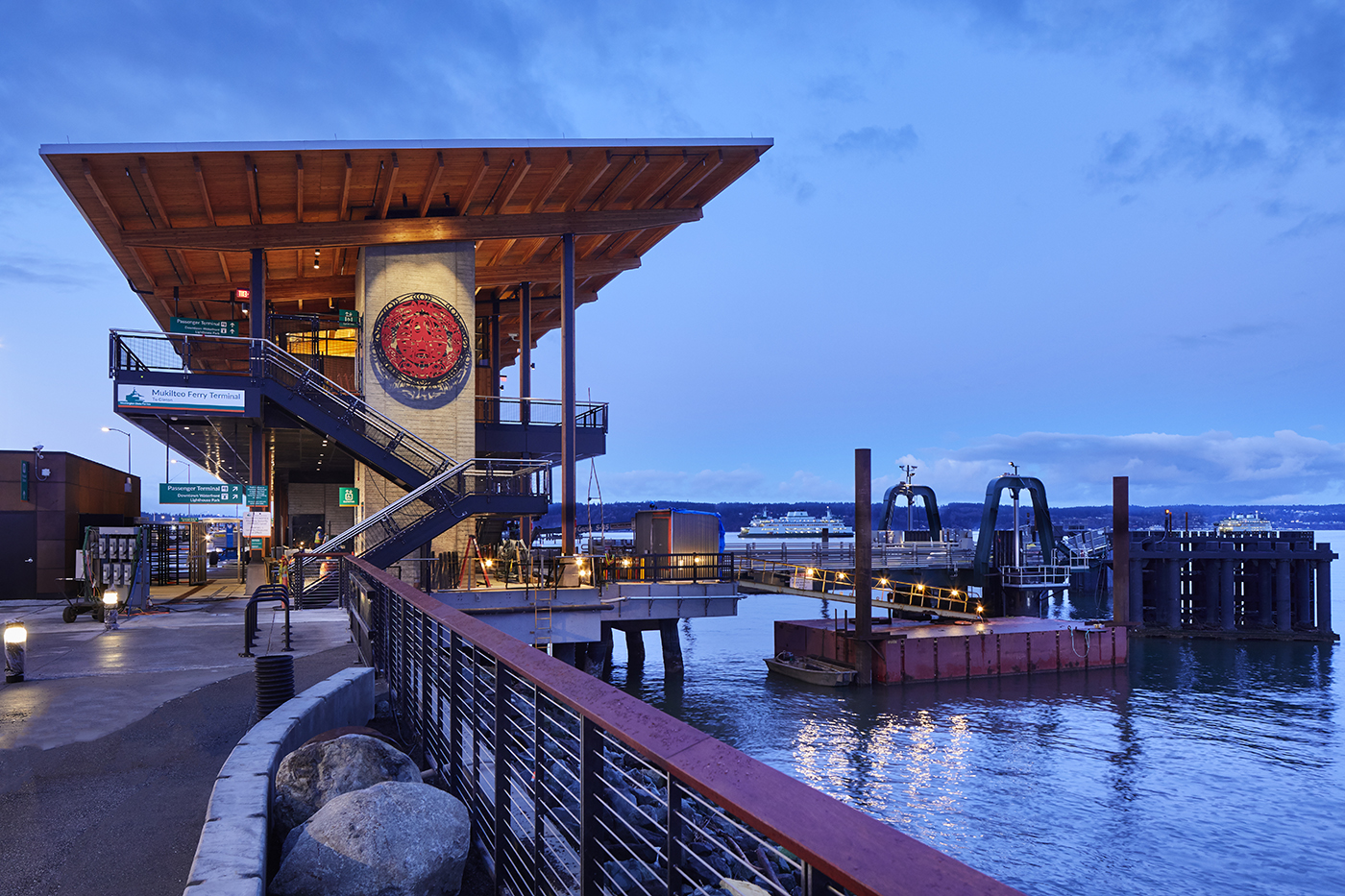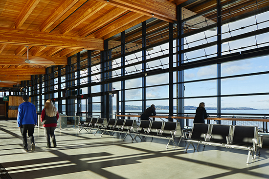 The centerpiece is its two-story passenger building with elements of a longhouse in a 30-by-100-foot footprint, done in collaboration with seven Coast Salish tribes. It is clad in cedar siding and has large glass windows facing Puget Sound. Elevators at the east and west ends lead to a linear promenade at the upper level, from which entries to the ticketing and waiting area are plainly visible.