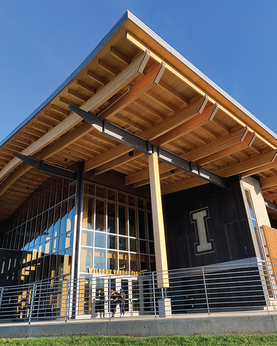 The 70,000-square-foot arena was constructed using engineered wood mass timber in reflection of Idaho’s large wood industry. The university teamed up with local wood processing companies and used Idaho-area trees.
