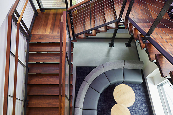 The branch has a double-height lobby with a wood and steel staircase linking the two main levels. Passersby can glimpse the interior from all sides of the building.