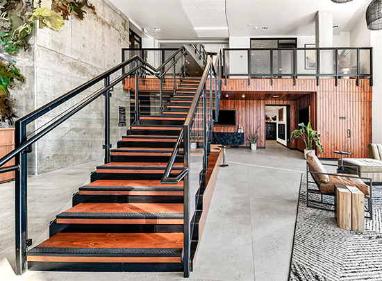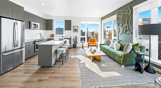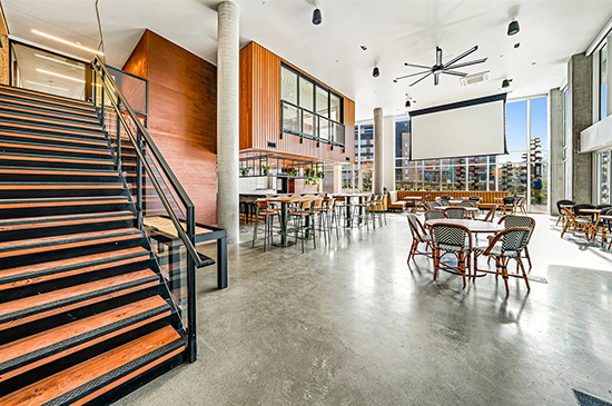 Interior amenities include a collaborative working space and an on-premise bike shop. Bike-friendly facilities and easy access to public transit help reduce residents’ dependence on vehicles.