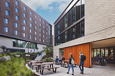 The Summit Hall residence hall and the Terrace Dining Pavilion comprise the first phase of a new residential village at the University of Washington Bothell campus.