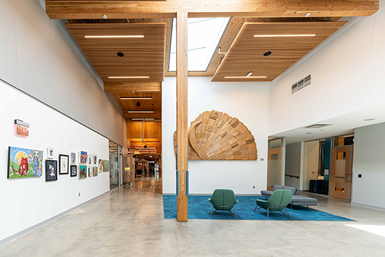 Public art celebrates Redmond’s culture, history and diversity, including a multi-story mural visible in the entryway.