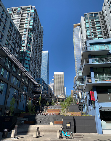 The Harbor Steps Plaza comprises 107 steps connecting First Avenue to Western Avenue, passing through the four-building Harbor Steps development.