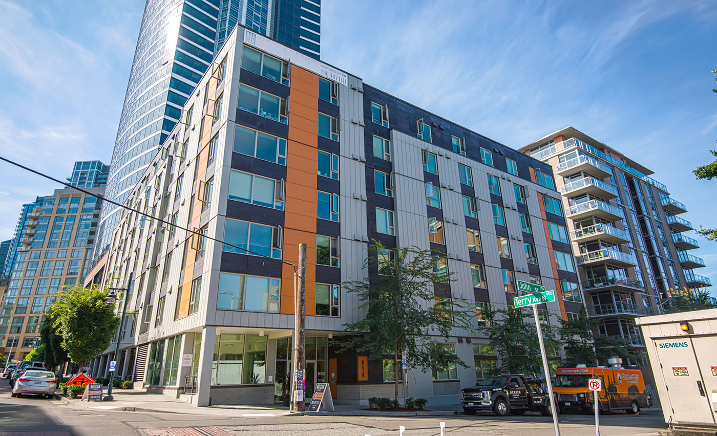In South Lake Union, Tarragon completed its 145-unit Boxcar apartments about a decade ago. Ankrom Moisan was the architect, and Rushforth Construction the builder. Now Northmarq has announced that its Bob Spiro recently arranged an over $17.8 million refinancing package via Fannie Mae. Spiro said in a statement, “Fannie Mae continues to provide best in class apartment financing products that meet our client's needs.” The new fixed-rate loan is structured with a five-year, interest-only term with a 5.36% interest rate. Boxcar, at 975 John St. (on the corner of Terry Avenue North), is surrounded by its taller SLU brethren. It was notable for employing some modular components, including steel framing instead of the usual wood-frame method for such midrise projects.
