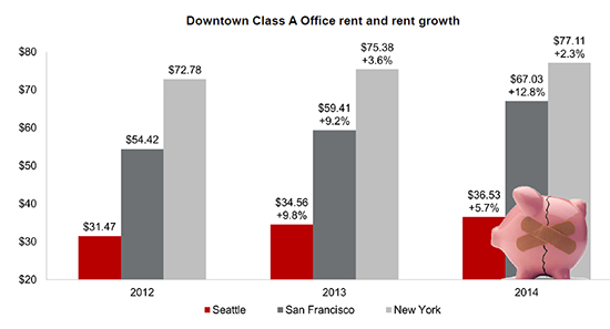 In 2014, rent for Class A downtown Seattle office space was $36.53 per square foot. That is a 5.7 percent annual increase. In 2013, rents jumped 9.8 percent.