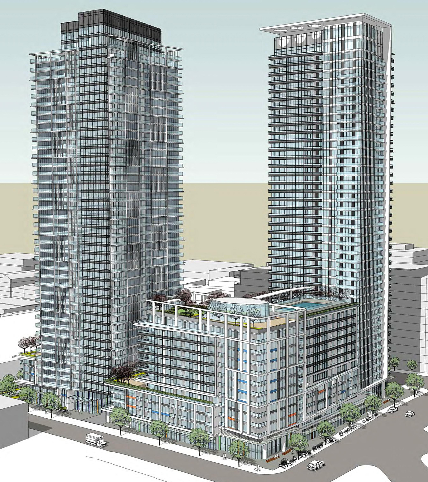 The southern block at 1120 Denny Way would have two 41-story towers with 1,067 units, 28,090 square feet of retail and underground parking for 1,347 vehicles. The northern block at 1120 John St. will have a 29-story and 36-story tower with 843 units, 17,630 square feet of retail and 1,235 underground parking spaces.