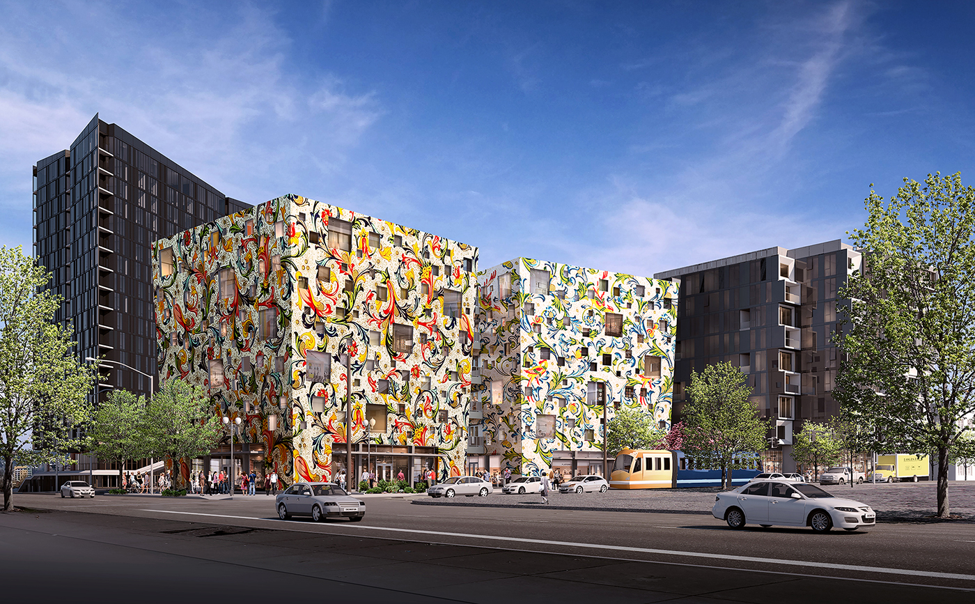 Cavenaugh considers himself a contrarian when it comes to real estate. A lot of tall residential buildings are going up near his site, so he went for a small office building. He found the cardboard models of his project looked dull, so he added some Florentine wrapping paper just for fun. Then he and a colleague realized they wanted that kind of look on the actual building.