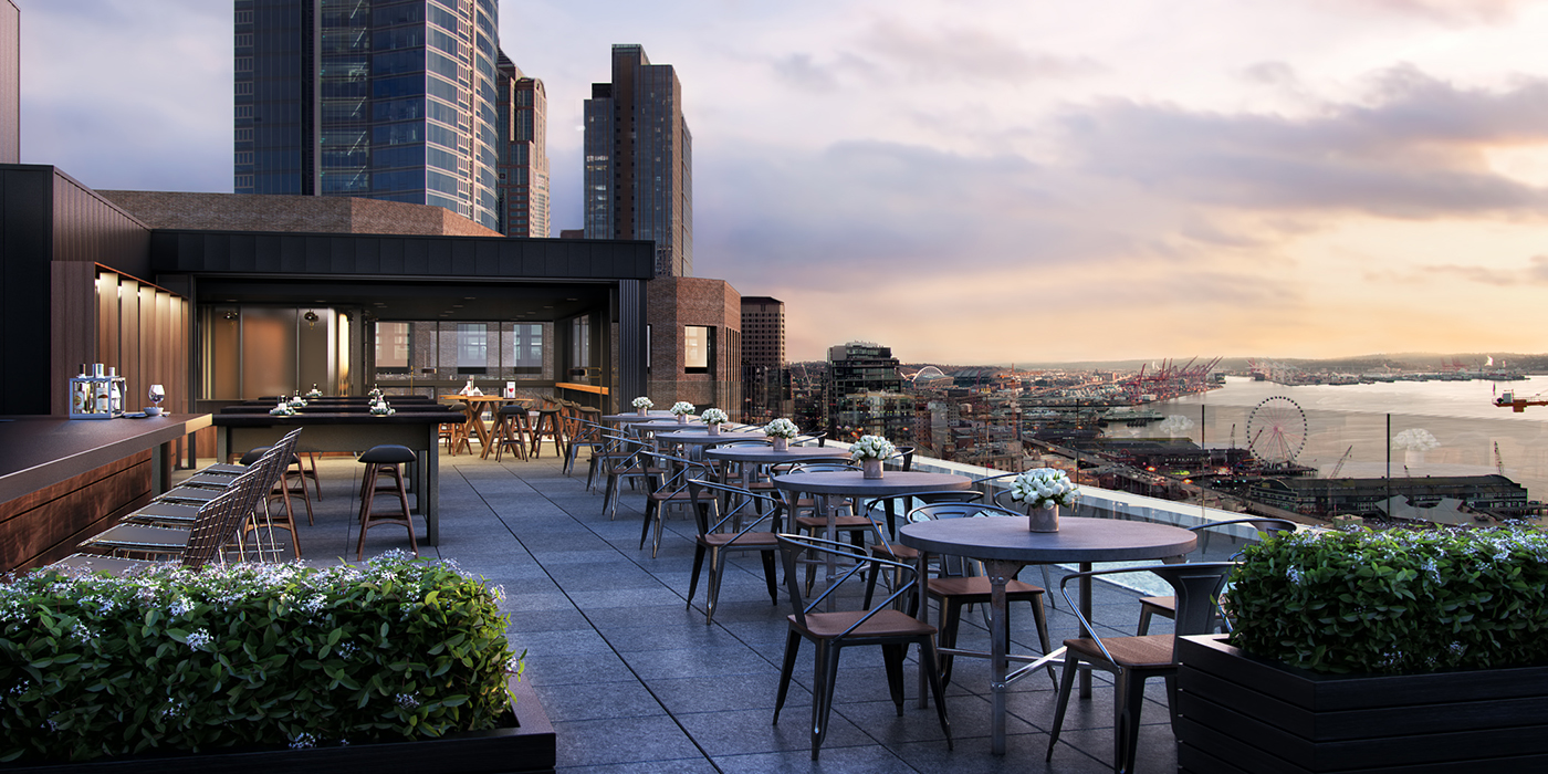 The latest example is the Thompson Seattle hotel. The roof of the 12-story, 158-room hotel at 110 Stewart St. has a restaurant called Scout and a bar and lounge called The Nest. Both will be operated by Josh Henderson of Huxley Wallace Collective.