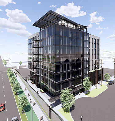 Project numbers haven't changed much since the prior review last fall: eight stories, with about 116,000 square feet of offices and 6,100 square feet of retail/commercial space. Two levels of underground parking will have 66 stalls — seven with charging stations for electric vehicles. A bike room will have 107 stalls, plus a shower and repair station.