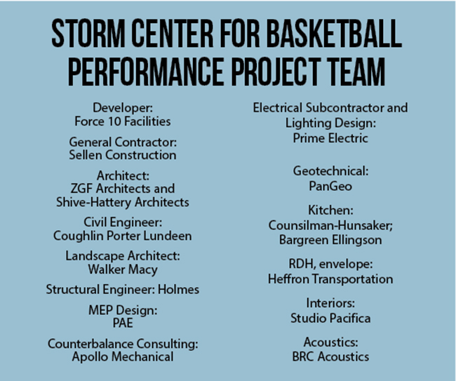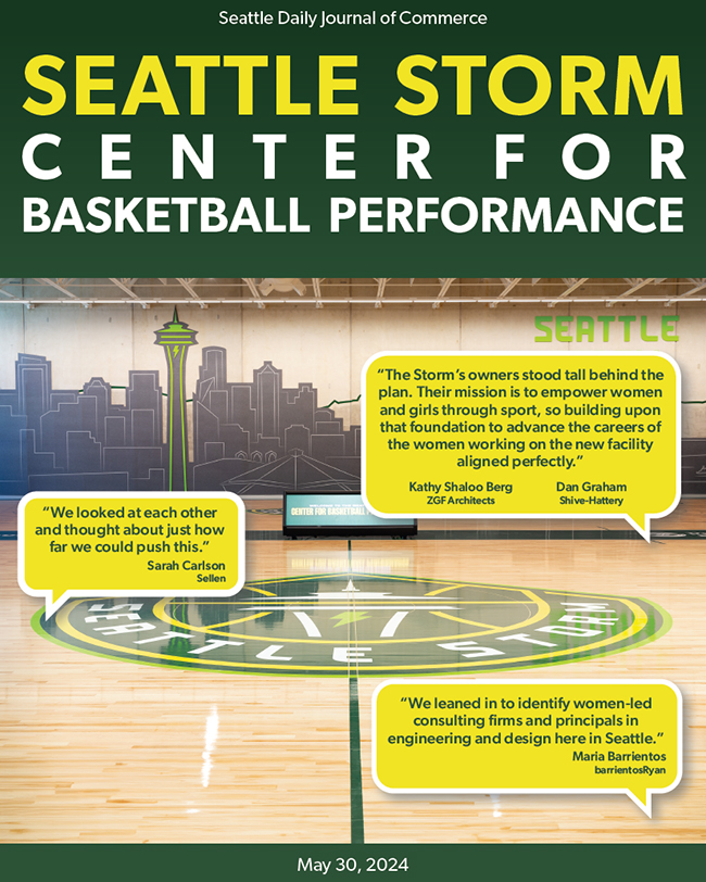 The Seattle Storm Center for Basketball Performance is the first ground-up practice facility built for a professional women's sports franchise, and the women-led design team pushed to make it a signature statement.